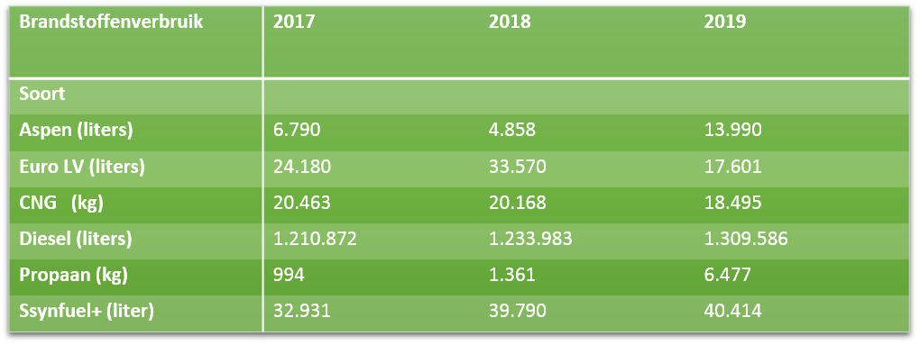 We streven ernaar in de komende jaren telkens 5% CO2-reductie te realiseren, dit in lijn met de doelen in het kader van de Clean Tech-regio. Concreet zou dit betekenen dat er eind 2019 13 (vooral zware voertuigen) op Synnfuel zouden rijden. De besluitvorming hierover is echter uitgesteld.